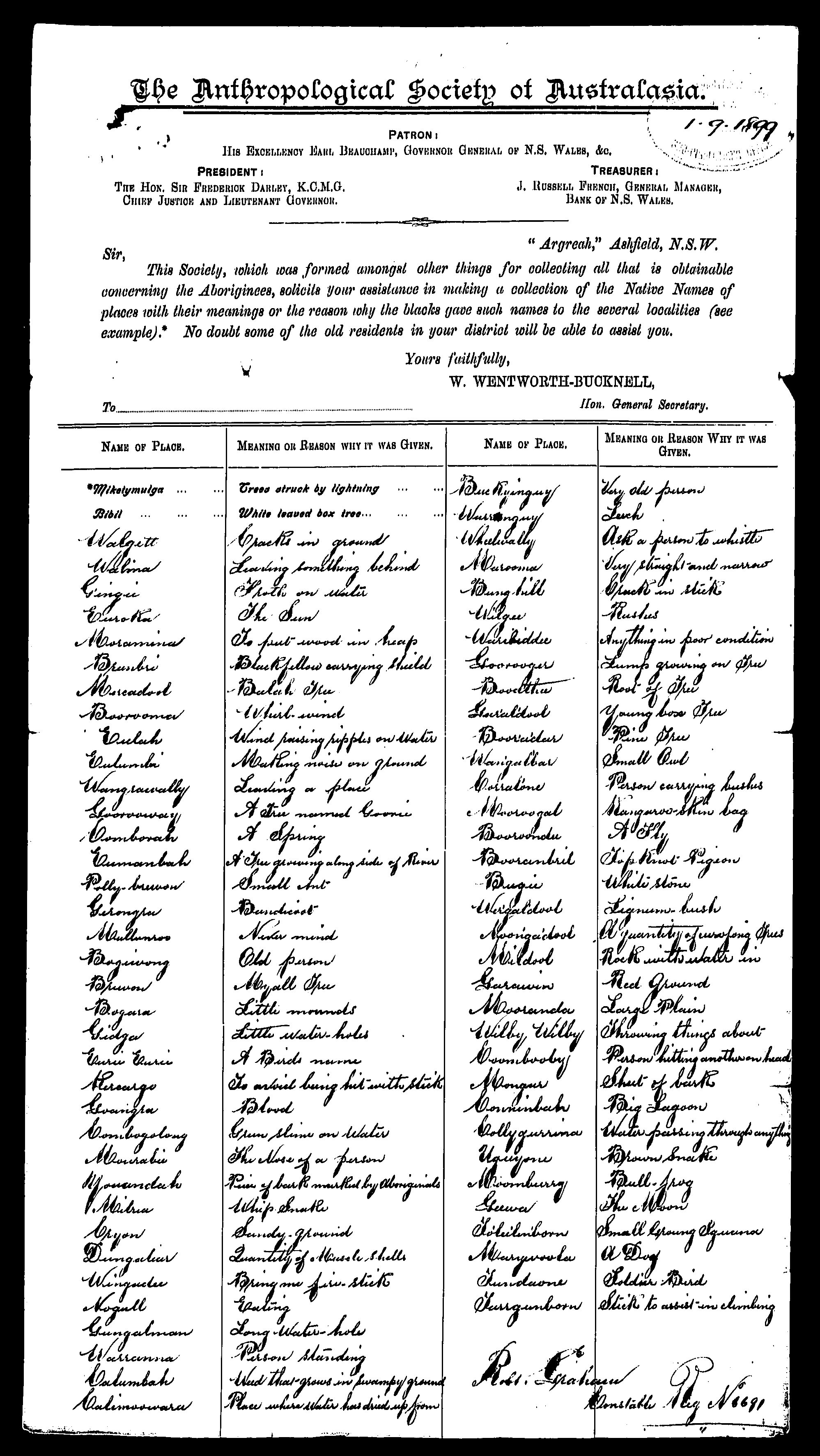 In 2004 the Geographical Names Board published copies of documents submitted in the 1800’s with information about Aboriginal placenames. Folder 2, file 13, (above) also gives the meaning as ‘high hills’ and the spelling as Wolger (not Wolgēr). Folder 1, file 66 (at end) has: Walgett ‘cracks in the ground’, using the current spelling of the word. (As far as I know these files are not available online.)