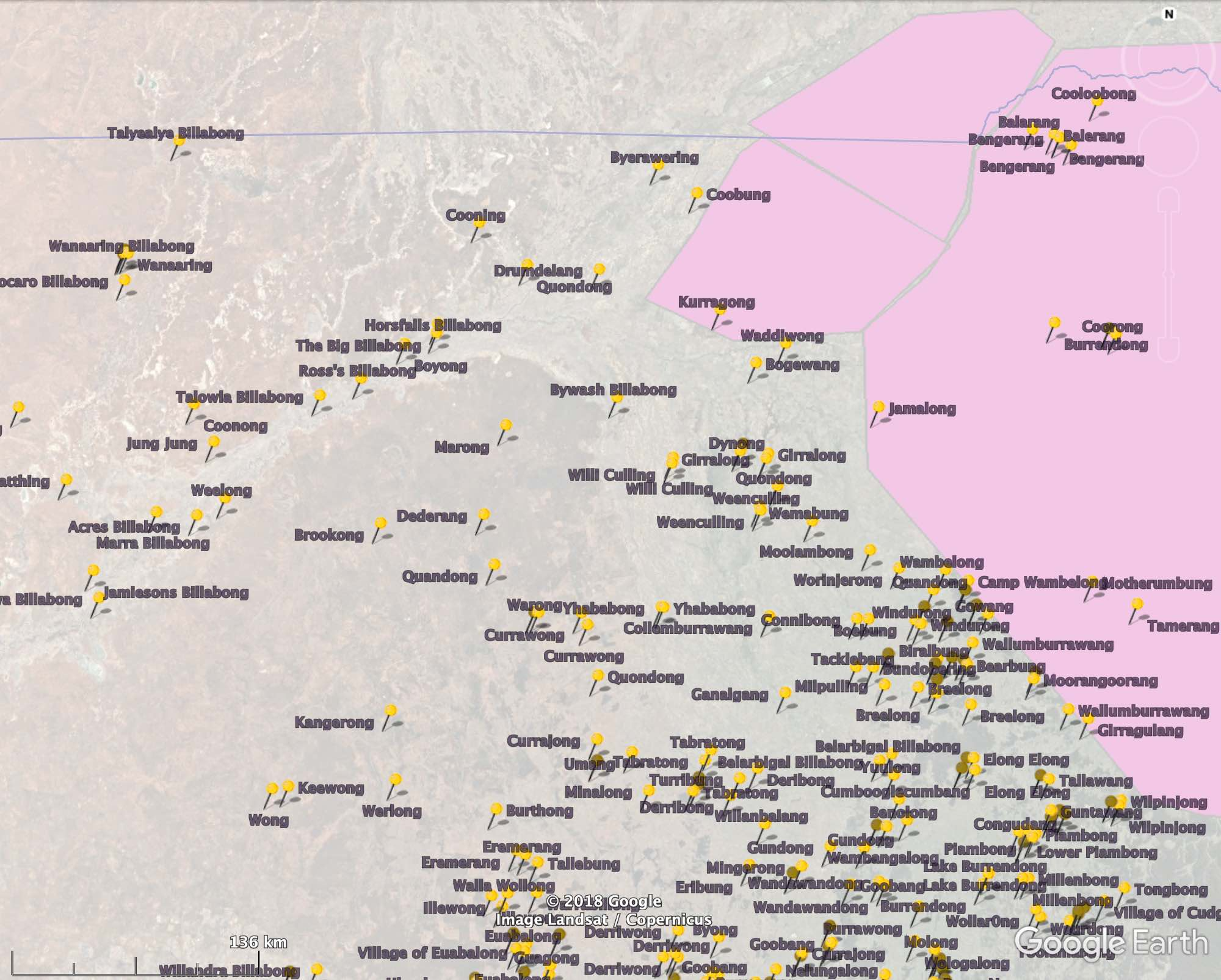Attached is a screenshot from GEarth overlaid also with Claire Bowern’s regions for GYY. It is pretty striking, isn’t it, how the ng-final placenames avoid those regions. And the few ng-final placenames in there, if you look into them, look like will prove to be exonyms: eg Burrendong and Coorong copy-named from elsewhere.
