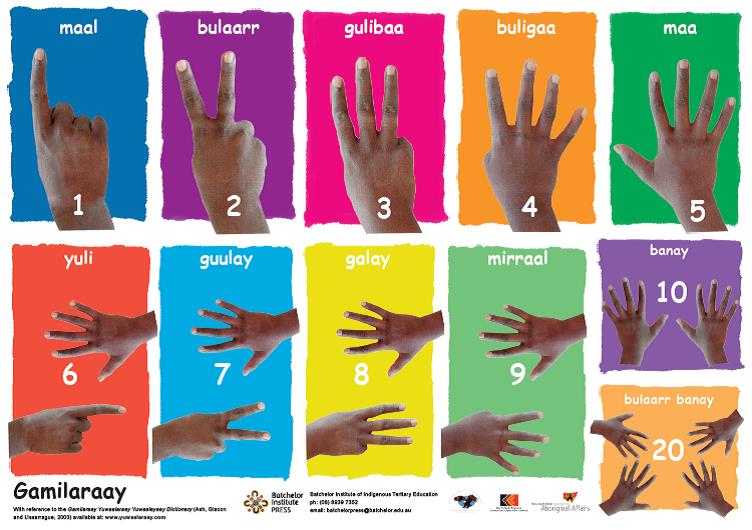 Maarubaa Hilary, who has worked with Batchelor Press to get number charts. http://batchelorpress.com/catalog/cards-posters -gu yananga, go down to the number chart and select Gamilaraay or Yuwaalaraay.