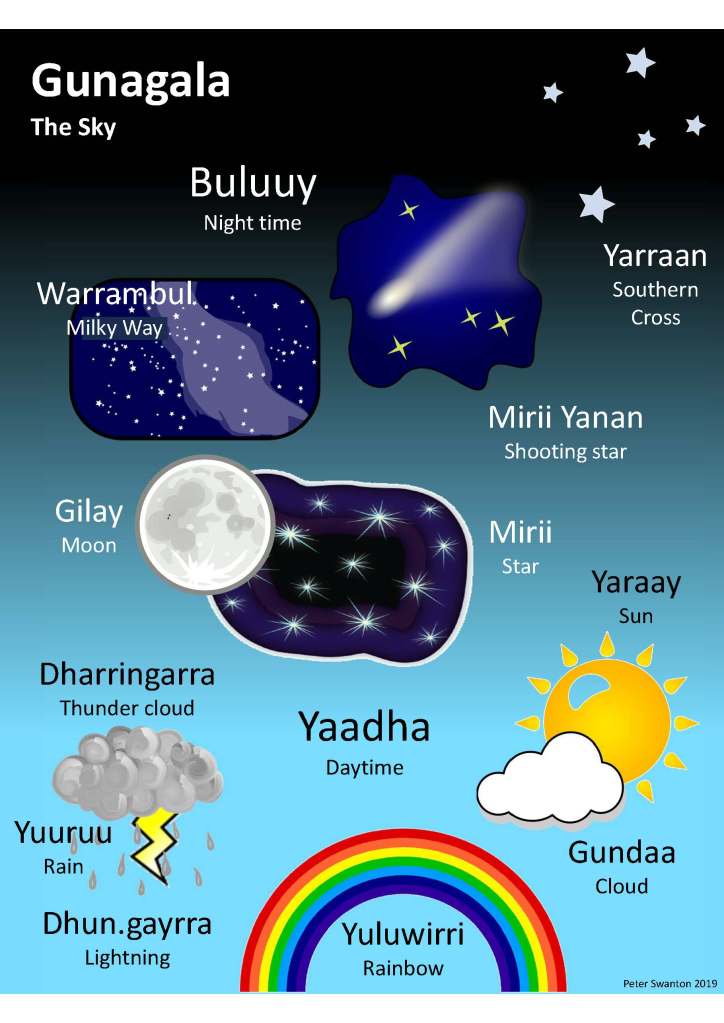 Peter Swanton and Hannah Golan Burnett did Gamilaraay 2 as a winter course at ANU. Part of the course was to prepare a resource. Peter, a Gamilaraay man and astrophysics student, now completing his degree, did the Gunagala(sky) poster. Hannah, a third year music student, wrote and and performed Yalaguwaay(like). Both dhirrabuu/deadly resources. You can download them by right-clicking on them.