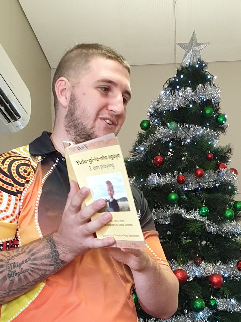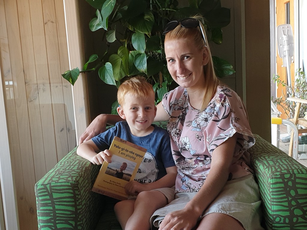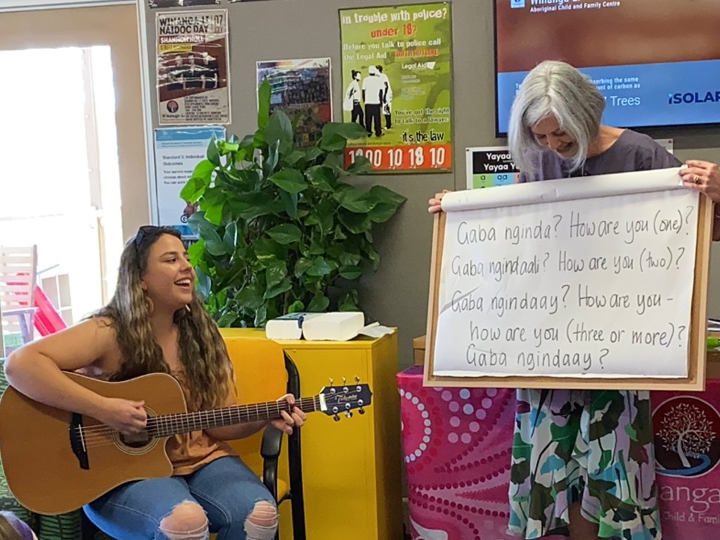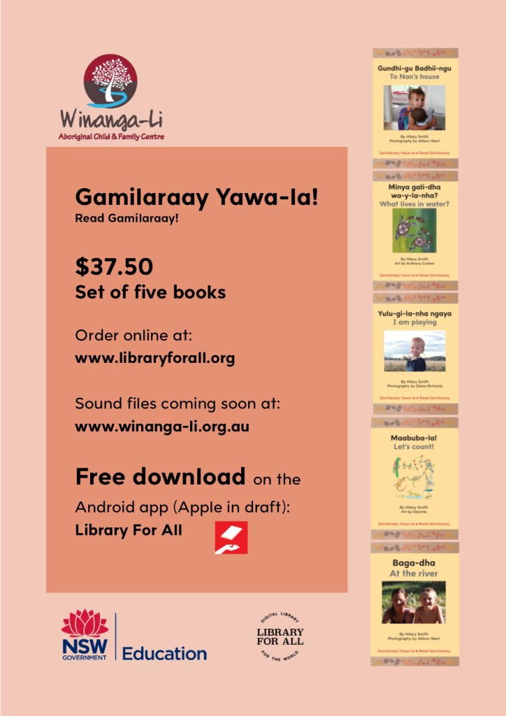 Yarraa-dha/On Yarraay/Thursday, Winanga-Li-dhu nguu Gamilaraay maa dhanggalma-y/Winanga-Li launched five Gamilaraay books, malawil-araay birralii-gal-gu Gunnedah-dhi/with photos of Gunnedah children, garay-baraay Gamilaraay-baraay/and with Gamilaraay text.
