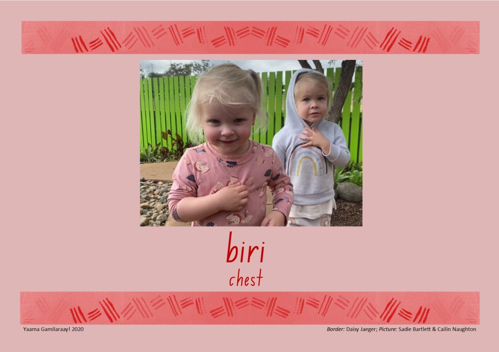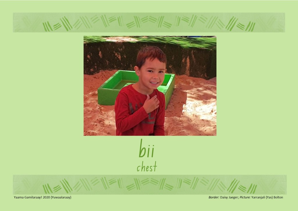 The words for ‘chest’ are slightly different in Yuwaalaraay and Gamilaraay, so: